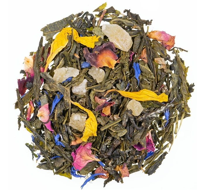 Biologische groene thee met lychee en rozensmaak, moringablad, kurkuma, citroenmelisse, gouds-en korenbloem