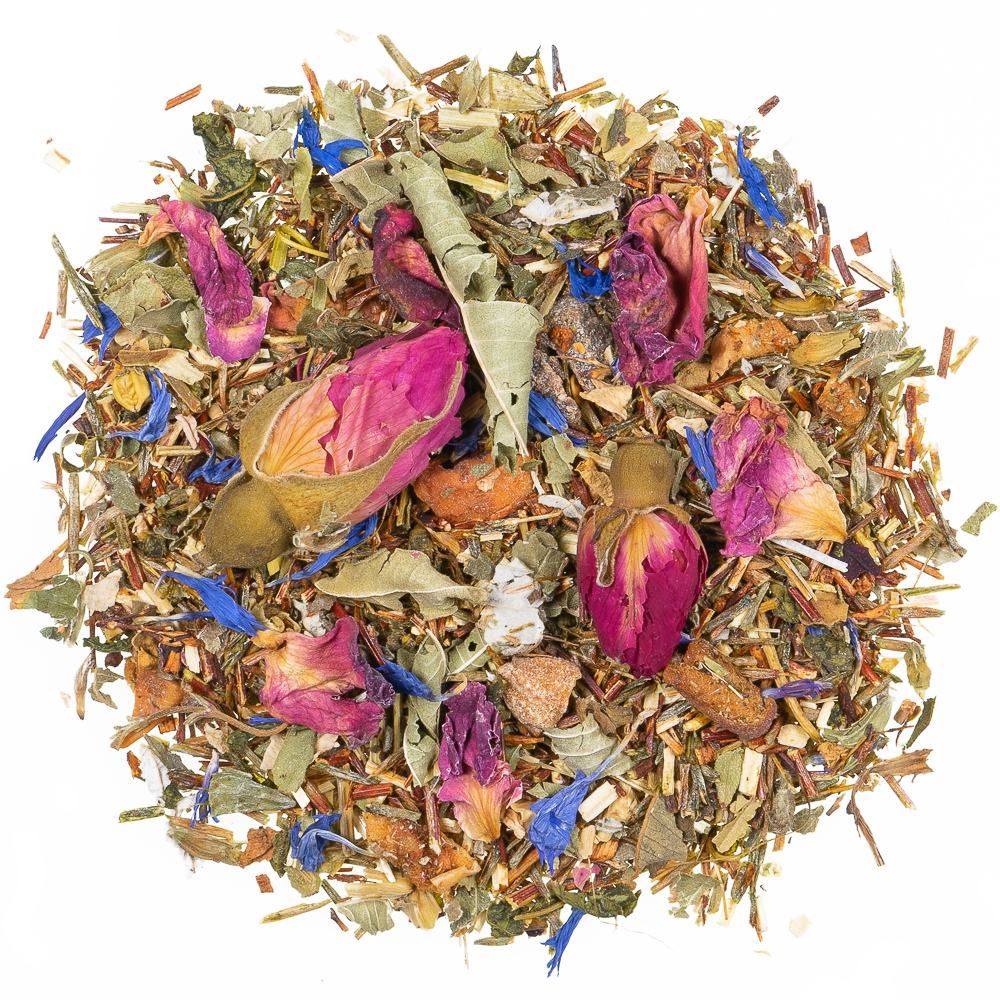 Kruidenthee met groene roooibos, stukjes appel en perzik, verveine, citroenmelisse, rozen en frambozenblaadjes